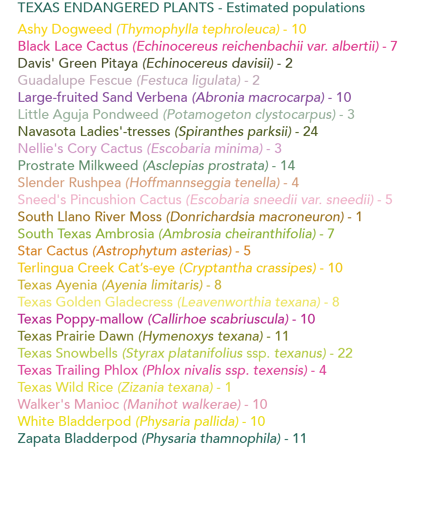 The Colors of Texas celebrates the remarkable biodiversity of our state through color — inspired by the endangered plants that still brighten our landscapes. Each hue represents a living piece of our natural heritage, and the width of each stripe reflects the estimated population of the species, reminding us how vibrant life can be when ecosystems thrive.